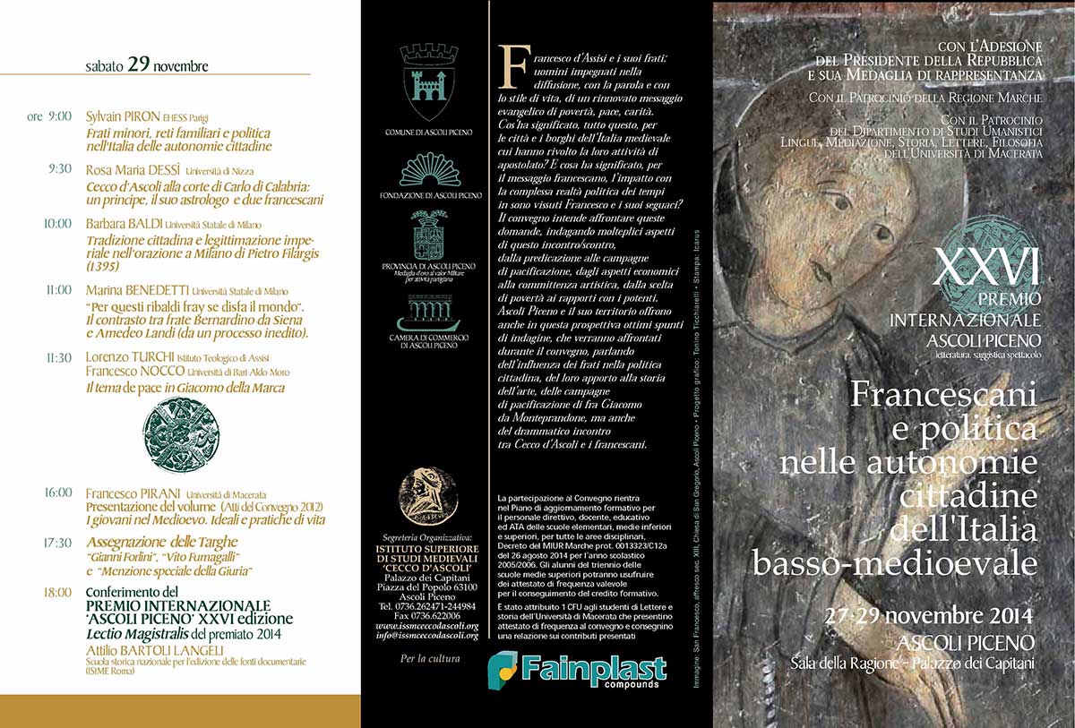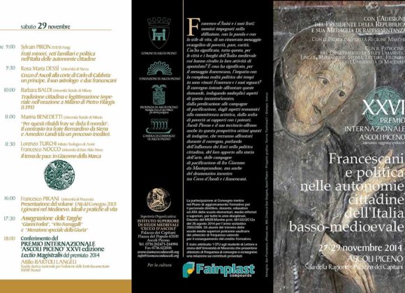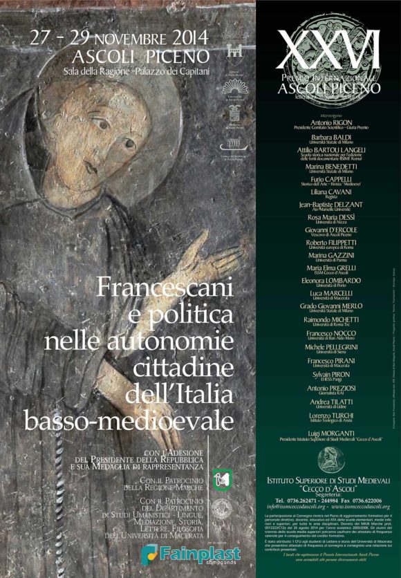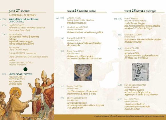 Francesco d’Assisi e i suoi frati: uomini impegnati nella diffusione, con la parola e con lo stile di vita, di un rinnovato messaggio evangelico di povertà, pace, carità. Cos’ha significato, tutto questo, per le città e i borghi dell’Italia medievale cui hanno rivolto la loro attività di apostolato? E cosa ha significato, per il messaggio francescano, l’impatto con la complessa realtà politica dei tempi in cui sono vissuti Francesco e i suoi seguaci? Il convegno intende affrontare queste domande, indagando molteplici aspetti di questo incontro/scontro, dalla predicazione alle campagne di pacificazione, dagli aspetti economici alla committenza artistica, dalla scelta di povertà ai rapporti con i potenti. Ascoli Piceno e il suo territorio offrono anche in questa prospettiva ottimi spunti di indagine, che verranno affrontati durante il convegno, parlando dell’influenza dei frati nella politica cittadina, del loro apporto alla storia dell’arte, delle campagne di pacificazione di fra Giacomo da Monteprandone, ma anche del drammatico incontro tra Cecco d’Ascoli e i francescani.